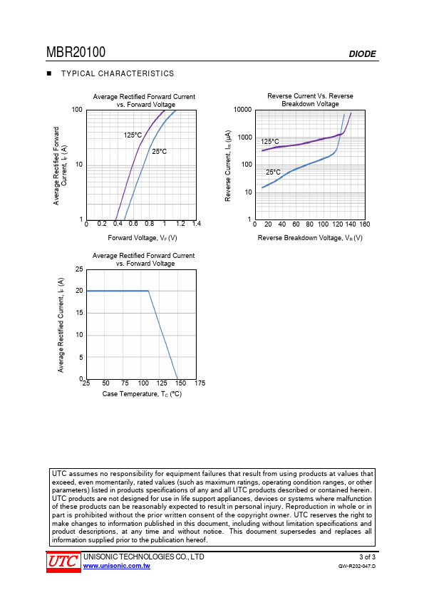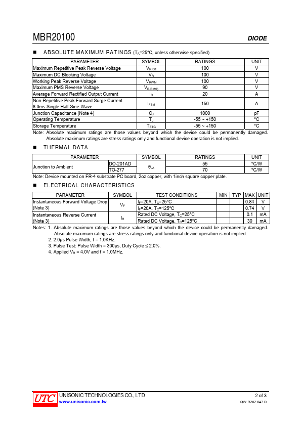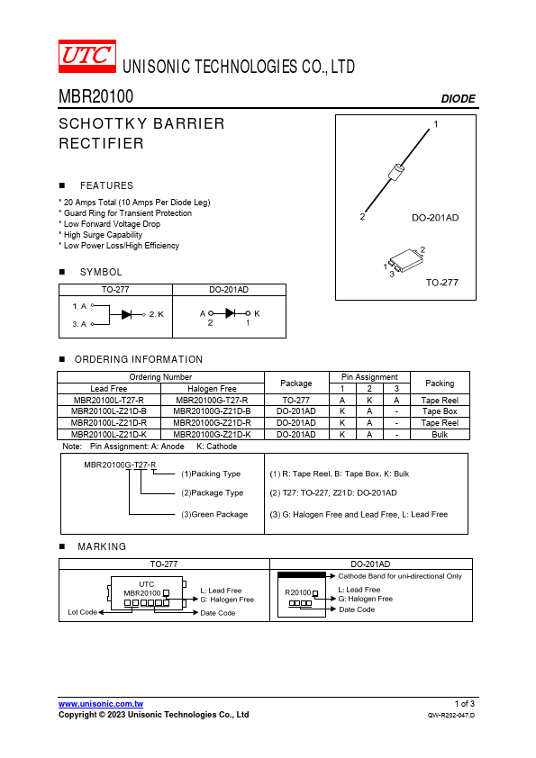 UNISONIC TECHNOLOGIES CO., LTD MBR20100 SCHOTTKY BARRIER RECTIFIER.