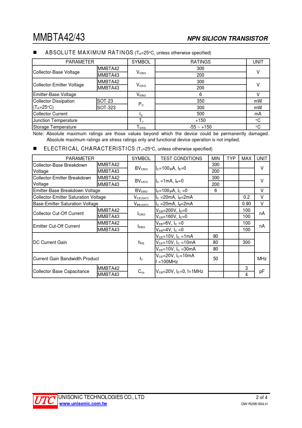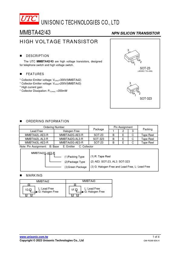 Overview: UNISONIC TECHNOLOGIES CO., LTD MMBTA42/43 NPN SILICON TRANSISTOR HIGH VOLTAGE TRANSISTOR.