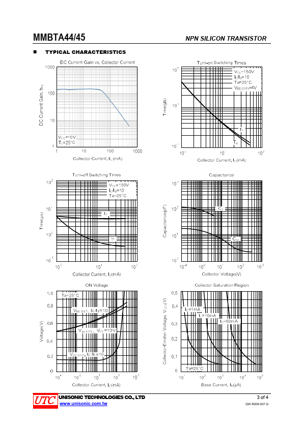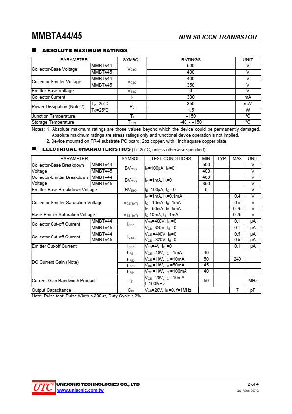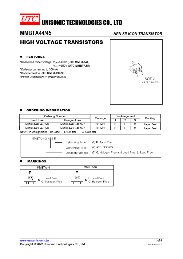 - Collector-Emitter voltage: VCEO=400V (UTC MMBTA44) VCEO=350V (UTC MMBTA45)
