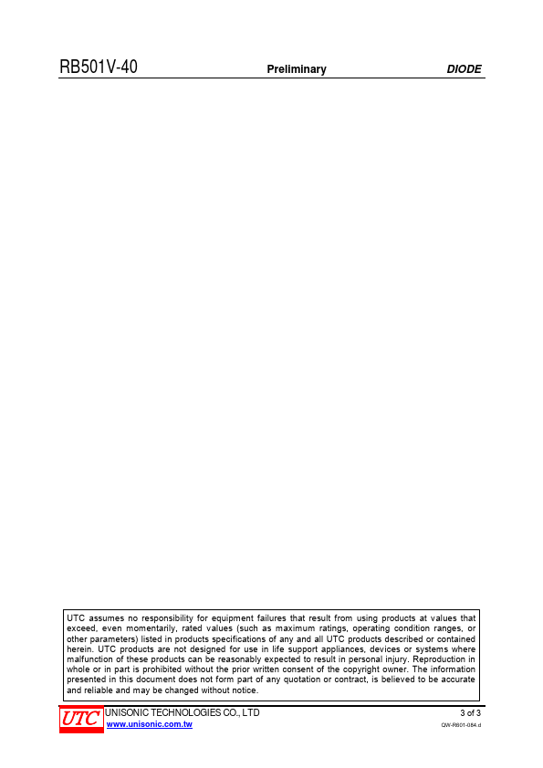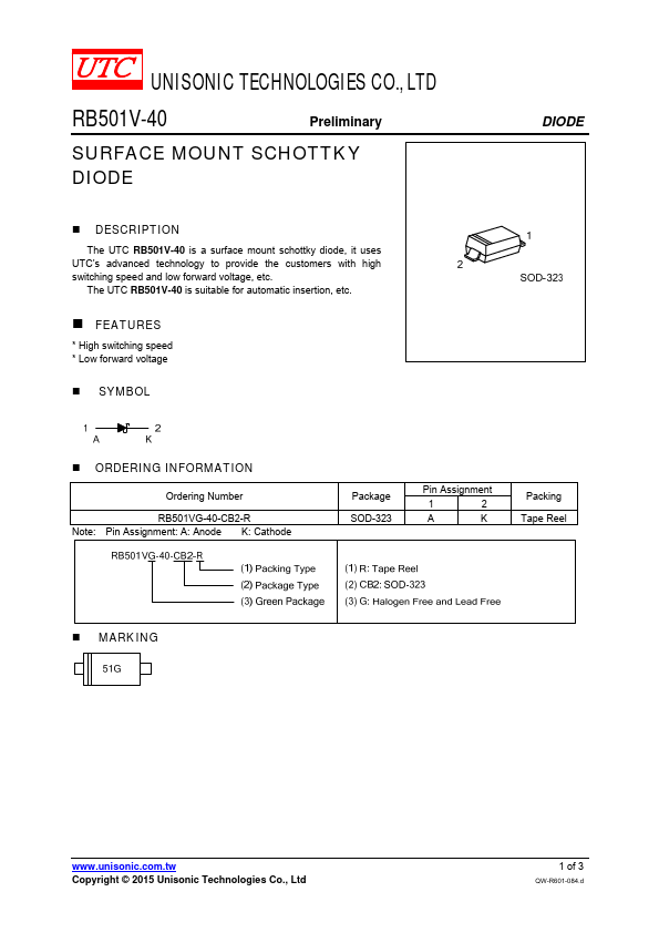 The UTC RB501V-40 is a surface mount schottky diode, it uses UTC’s advanced technology to provide the customers with high switching speed and low forward voltage, etc. The UTC RB501V-40 is suitable for automatic insertion, etc.