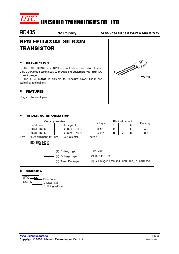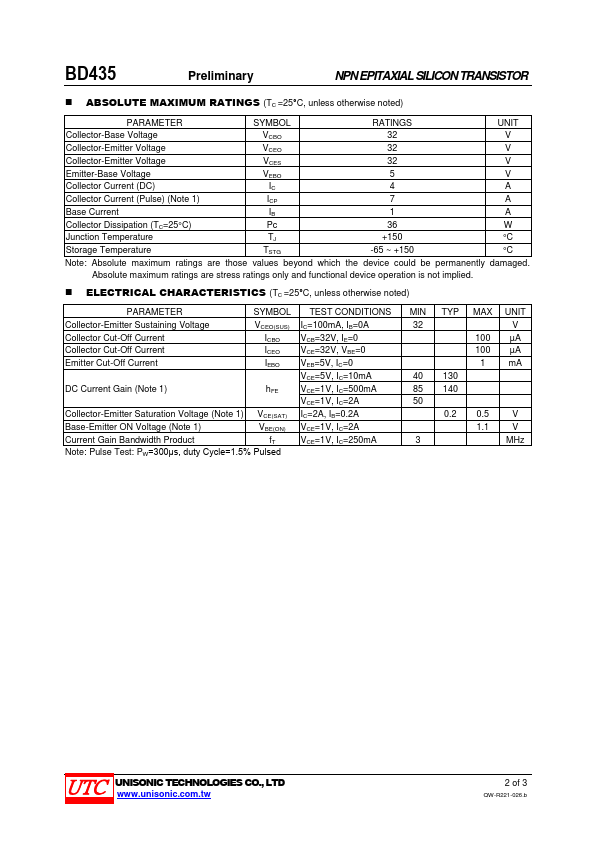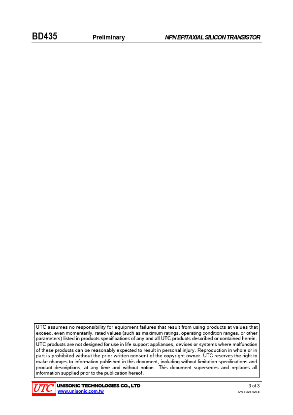 Overview: UNISONIC TECHNOLOGIES CO., LTD BD435 Preliminary NPN EPITAXIAL SILICON TRANSISTOR NPN EPITAXIAL SILICON TRANSISTOR.