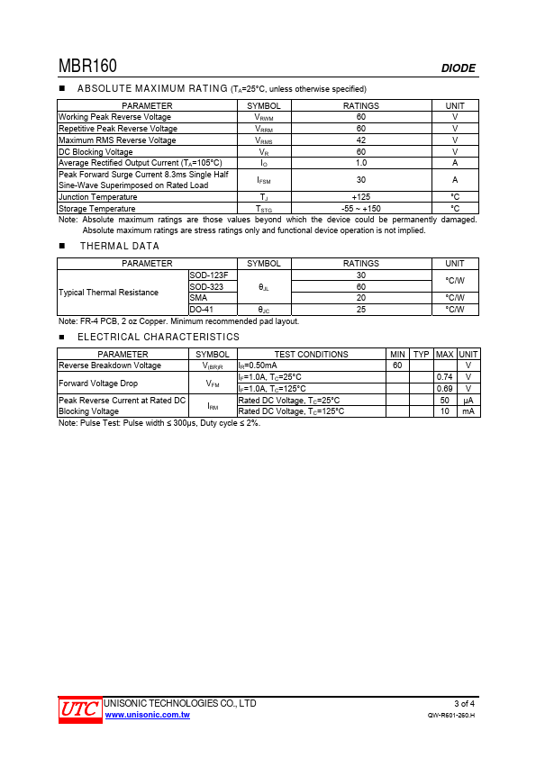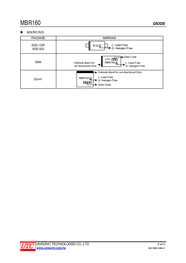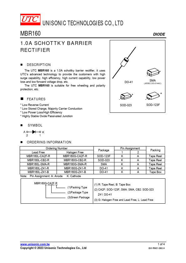 The UTC MBR160 is a 1.0A schottky barrier rectifier, it uses UTC’s advanced technology to provide the customers with high surge capability, high efficiency, high current capability, low power loss and low forward voltage drop, etc. The UTC MBR160 is suitable for free wheeling and polarity protection, etc.