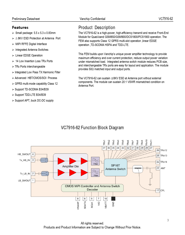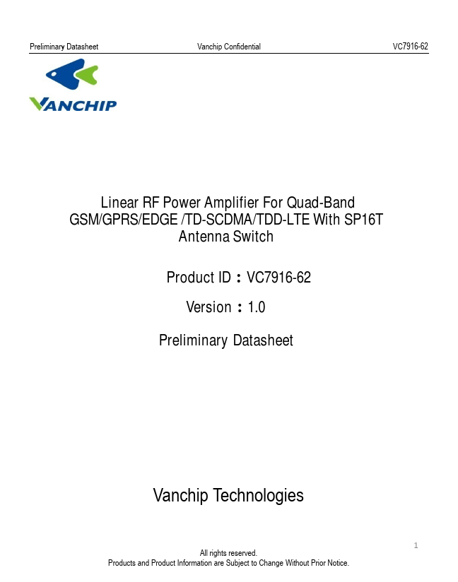 The VC7916-62 is a high-power, high-efficiency transmit and receive Front-End Module for Quad-band GSM850/GSM900/DCS1800/PCS1900 operation. The FEM also supports Class 12 GPRS multi-slot operation ,linear EDGE operation ,TD-SCDMA HSPA and TDD-LTE. This FEM builds upon Vanchip’s unique power amplifier technology to provide maximum efficiency and over current protection, reduce output power variation under mismatched...