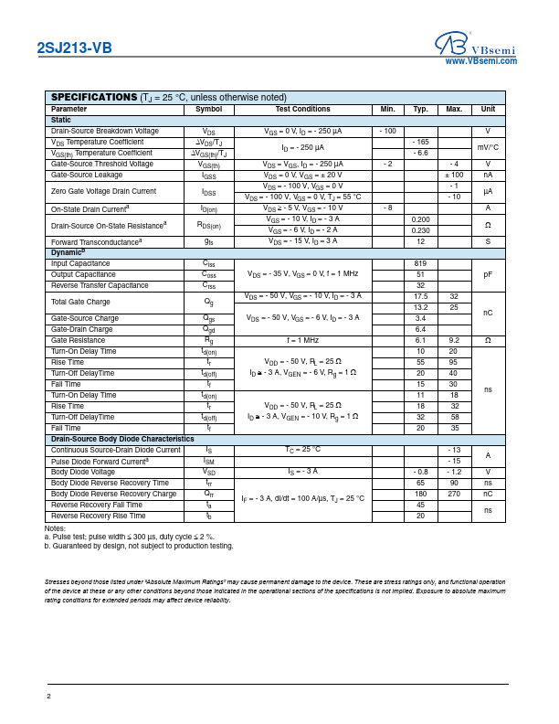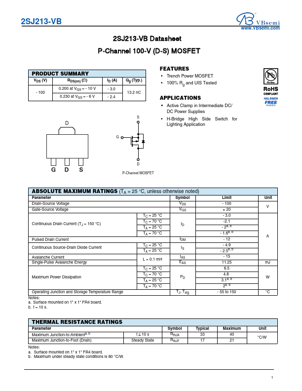 2SJ213-VB Datasheet P-Channel 100-V (D-S) MOSFET