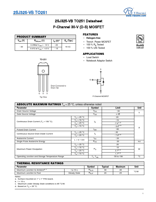 2SJ325-VB TO251 Datasheet P-Channel 30-V (D-S) MOSFET