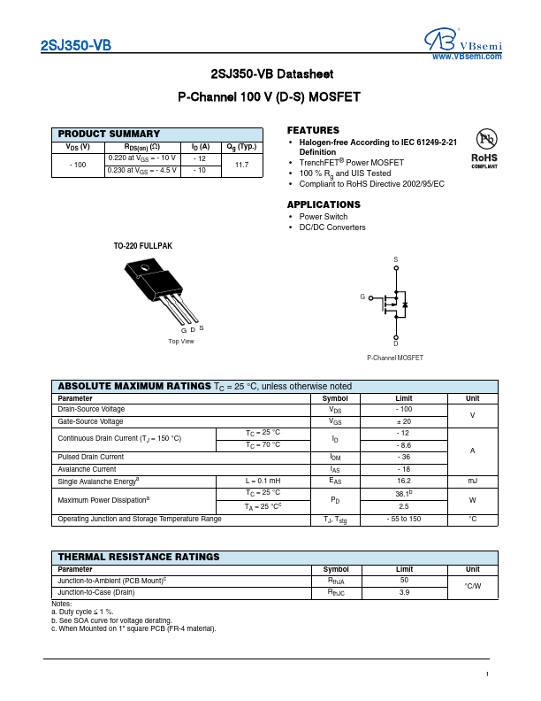 2SJ350-VB Datasheet P-Channel 100 V (D-S) MOSFET