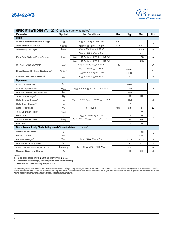 2SJ492-VB Datasheet P-Channel 60 V (D-S) MOSFET