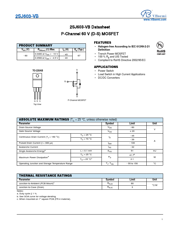 2SJ603-VB Datasheet P-Channel 60 V (D-S) MOSFET