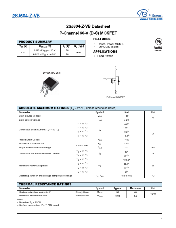 • Trench Power MOSFET • 100 % UIS Tested APPLICATIONS • Load Switch