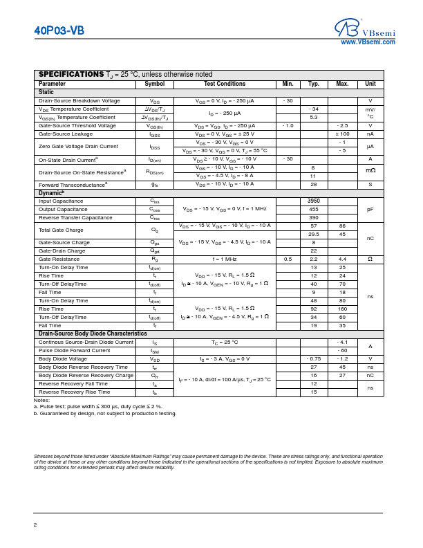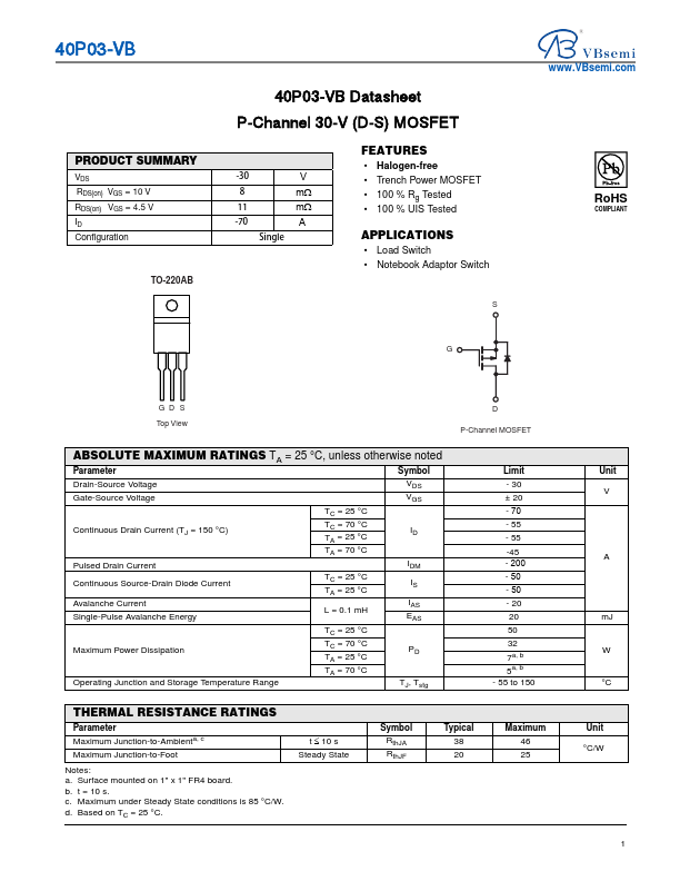 40P03-VB Datasheet P-Channel 30-V (D-S) MOSFET