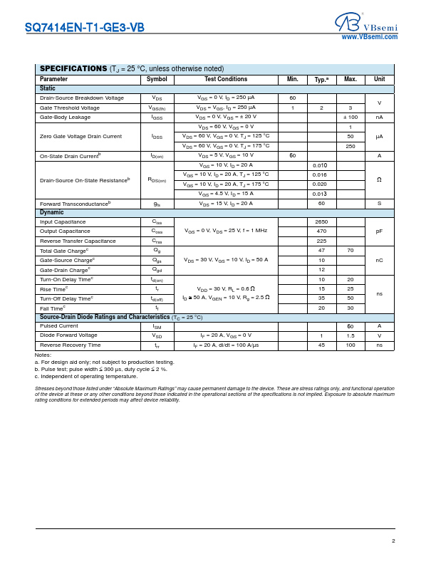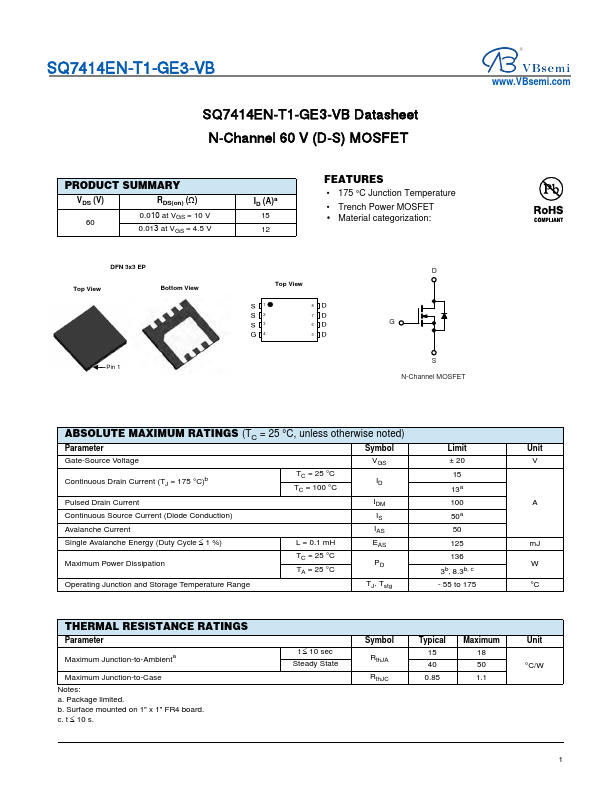 SQ7414EN-T1-GE3-VB SQ7414EN-T1-GE3-VB Datasheet N-Channel 60 V (D-S) MOSFET .VBsemi. PRODUCT SUMMARY VDS (V) RDS(on) () 60 0.010 at VGS = 10 V 0.013 at VGS = 4.5 V DFN 3x3 EP Top View Bottom View Pin 1 ID (A)a 15.