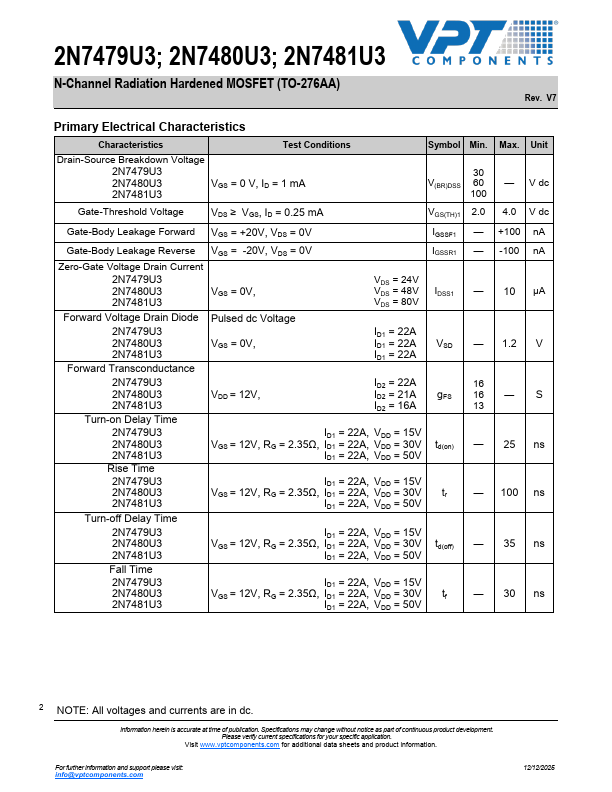 2N7481U3 N-Channel Radiation Hardened MOSFET (TO-276AA) Introduction VPT ponents' new radiation-tolerant power MOSFETs are now available in die and standard U3 package options, as well as custom packaging for HiRel environments. Applications within the military, aerospace, medical, nuclear power generation, and high-energy physics research laboratories can benefit from the use of this new series of MOSFETs. VPT...