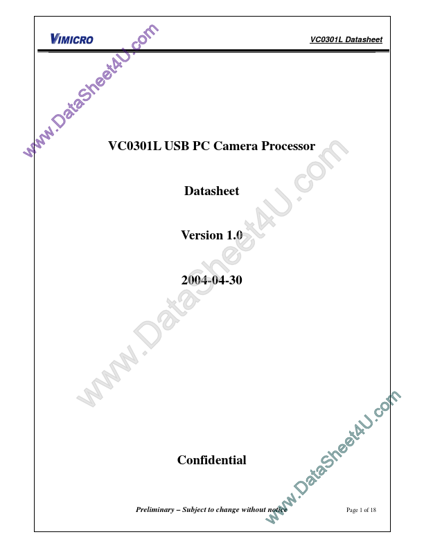 4CU0.3c0o1mL USB PC Camera VC0301L Processor Datasheet .com Datasheet t4U Version 1.0 hee 2004-04-30 Confidential Preliminary – Subject to change without notice Page 1 of 18 VC0301L Data...