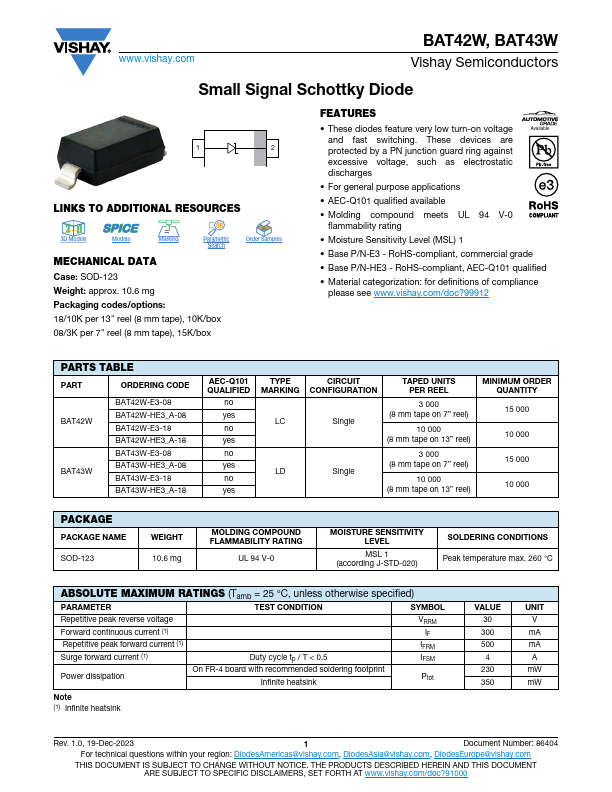Overview: .vishay. BAT42W, BAT43W Vishay Semiconductors Small Signal Schottky Diode 1 2 LINKS TO ADDITIONAL RESOURCES 3D 3D 3D Models Models Marking Parametric Search Order Samples MECHANICAL DATA Case: SOD-123 Weight: approx. 10.