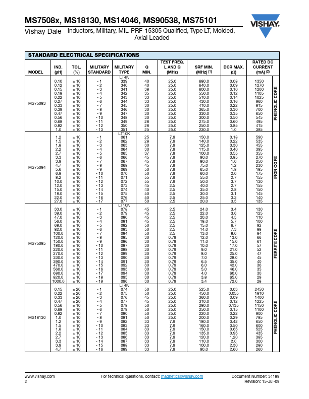 Inductors, Military, MIL-PRF-15305 Qualified, Type LT, Molded, Axial Leaded