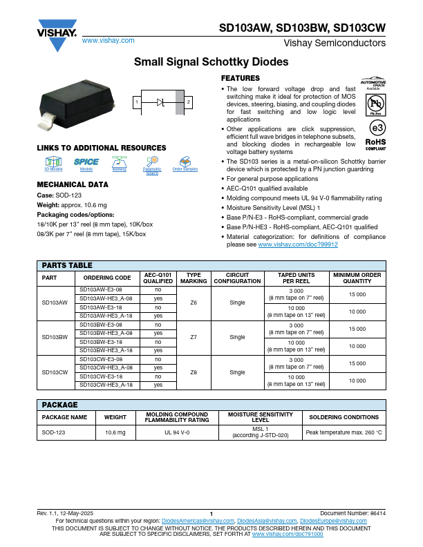 SD103AW, SD103BW, SD103CW Vishay Semiconductors Small Signal Schottky Diodes 1 2 LINKS TO ADDITIONAL RESOURCES 3D 3D 3D Models Models Marking Parametric Search Order Samples Case: 10.6 mg Packaging codes/options:.