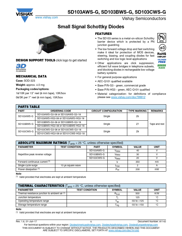 SD103AWS-G, SD103BWS-G, SD103CWS-G Vishay Semiconductors Small Signal Schottky Diodes DESIGN SUPPORT TOOLS click logo to get started Models Available Case: 4.0 mg Packaging codes/options:.