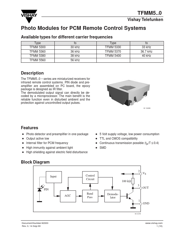 The TFMM5..0 series are miniaturized receivers for infrared remote control systems. PIN diode and preamplifier are assembled on PC board, the epoxy package is designed as IR filter. The demodulated output signal can directly be decoded by a microprocessor.