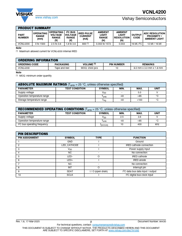 - for the best utilization of resources and power saving on the microcontroller. For the 12-bit / 16-bit proximity sensing function, VCNL4200 has a built-in intelligent cancellation scheme that eliminates background light issues. The persistence feature prevents false judgment of proximity sensing due to ambient light noise. The adoption of the patented FiltronTM technology achieves the closest ambient light spectral sensitivity to real human eye responses. VCNL4200 provides excellent temperature.
