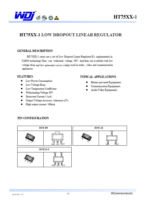 HT75XX-1 series are a set of Low Dropout Linear Regulator ICs implemented in CMOS technology.They can withstand voltage 30V. And they are available with low voltage drop and low quiescent current,widely used in audio, video and munication appliances.