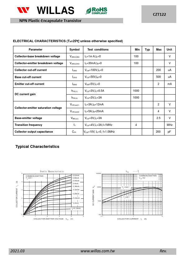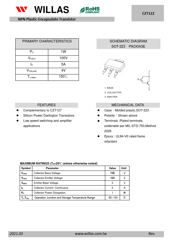 Overview: WILLAS NPN Plastic-Encapsulate Transistor CZT122 PRIMARY CHARACTERISTICS PC VCEO IC VCE(sat) TJ,Max 1W 100V 5A 4V.