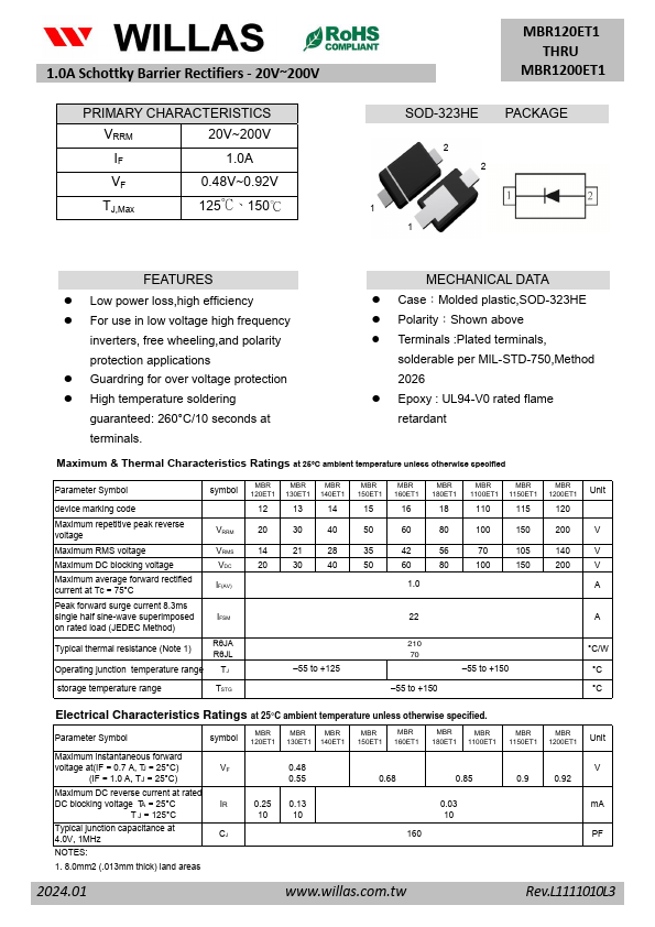 1.0A Schottky Barrier Rectifiers - 20V~200V PRIMARY CHARACTERISTICS VRRM 20V~200V IF 1.0A VF 0.48V~0.92V TJ,Max 125℃、150℃ MBR120ET1 THRU MBR1200ET1 SOD-323HE PACKAGE 2 2.