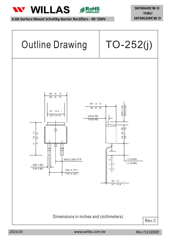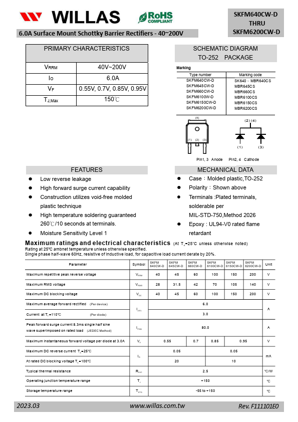 6.0A Surface Mount Schottky Barrier Rectifiers - 40~200V SKFM640CW-D THRU SKFM6200CW-D PRIMARY CHARACTERISTICS VRRM IO VF TJ,Max 40V~200V 6.0A 0.55V, 0.7V, 0.85V, 0.95V 150℃ SCHEMATIC DIAGRAM TO-252 PACKAGE Marking Type number SK FM640 CW-D SK FM645 CW-D SK.