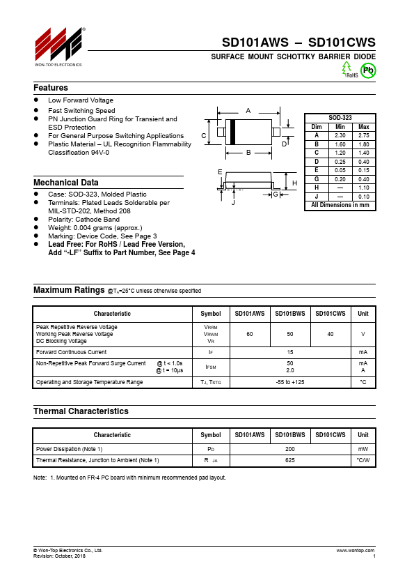 Overview: ® WON-TOP ELECTRONICS SD101AWS – SD101CWS SURFACE MOUNT SCHOTTKY BARRIER.