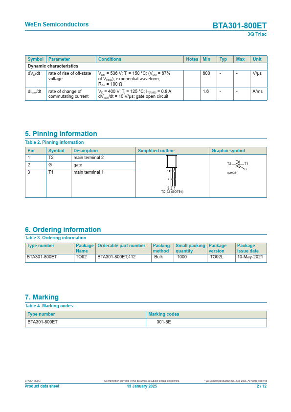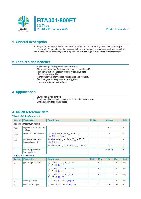 Planar passivated high mutation three quadrant triac in a SOT54 (TO-92) plastic package. This "series ET" triac balances the requirements of mutation performance and gate sensitivity and is intended for interfacing with low power drivers and logic ICs including microcontrollers.
