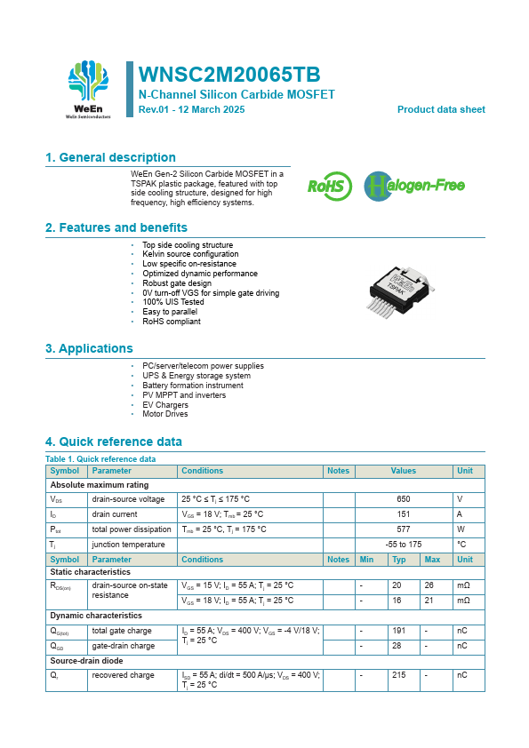 WeEn Gen-2 Silicon Carbide MOSFET in a TSPAK plastic package, featured with top side cooling structure, designed for high frequency, high efficiency systems.
