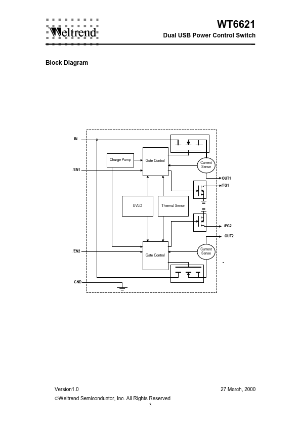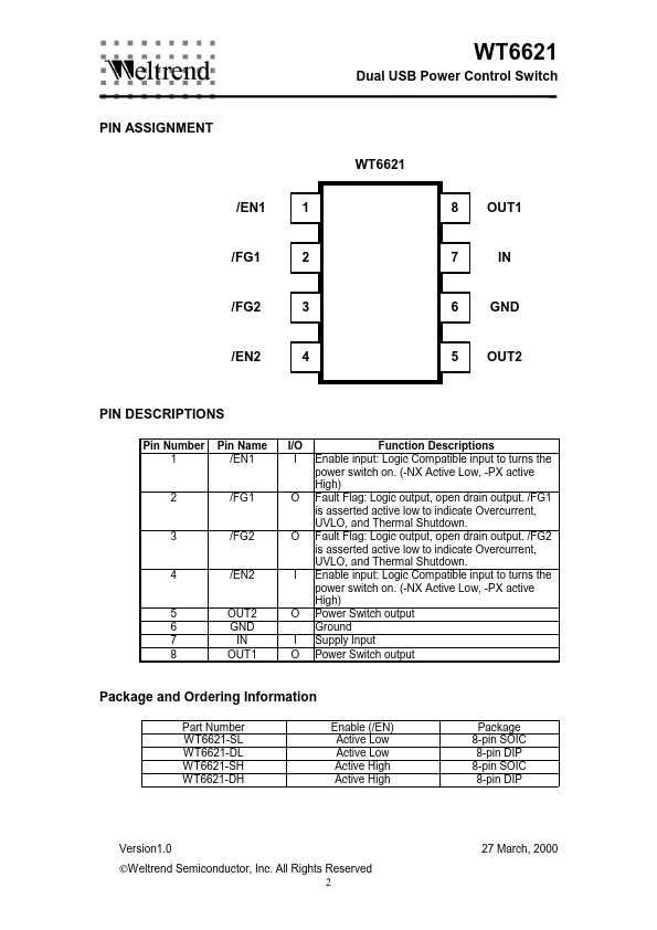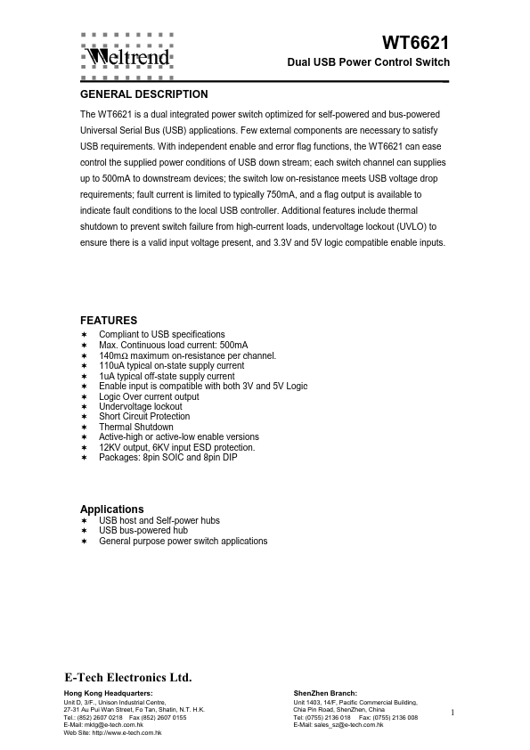 The WT6621 is a dual integrated power switch optimized for self-powered and bus-powered Universal Serial Bus (USB) applications.