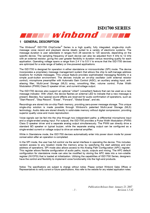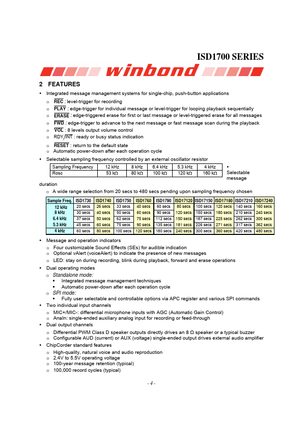 The Winbond® ISD1700 ChipCorder® Series is a high quality, fully integrated, single-chip multimessage voice record and playback device ideally suited to a variety of electronic systems. The message duration is user selectable in ranges from 26 seconds to 120 seconds, depending on the specific device. The sampling frequency of each device can also be adjusted from 4 kHz to 12 kHz with an external resistor, giving the...