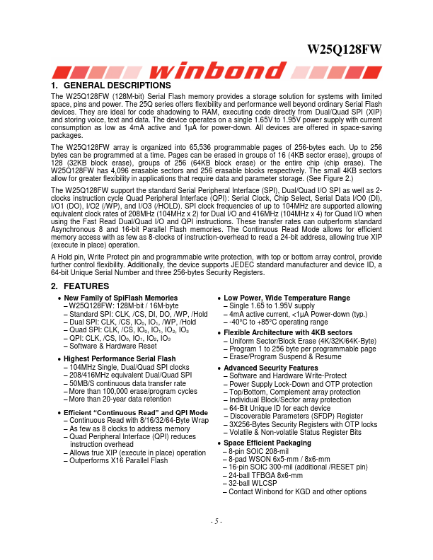 W25Q128FW 1.8V 128M-BIT SERIAL FLASH MEMORY WITH DUAL/QUAD SPI & QPI Publication Release Date: May 18, 2017 Revision K W25Q128FW 1. GENERAL DESCRIPTIONS The W25Q128FW (128M-bit) Serial Flash memory provides a storage solution for systems with limited space, pins and power.