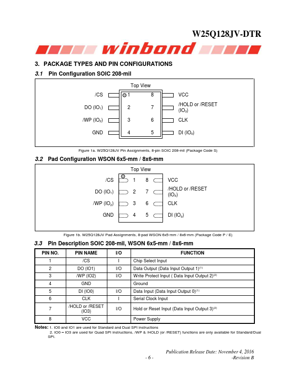 W25Q128JV-DTR 3V 128M-BIT SERIAL FLASH MEMORY WITH DUAL/QUAD SPI & QPI & DTR Publication Release Date: November 4, 2016 -Revision B W25Q128JV-DTR 1. GENERAL DESCRIPTIONS The W25Q128JV (128M-bit) Serial Flash memory provides a storage solution for systems with limited space, pins and power.