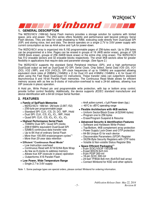 The W25Q16CV (16M-bit) Serial Flash memory provides a storage solution for systems with limited space, pins and power. The 25Q series offers flexibility and performance well beyond ordinary Serial Flash devices. They are ideal for code shadowing to RAM, executing code directly from Dual/Quad SPI (XIP) and storing voice, text and data.