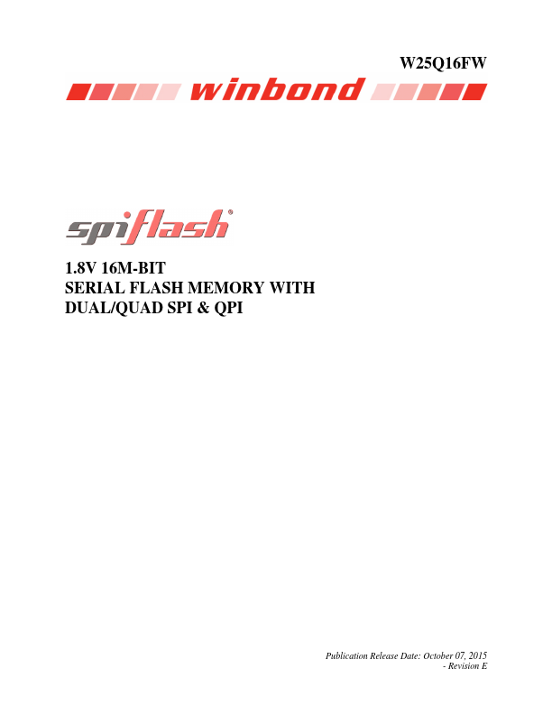 W25Q16FW 1.8V 16M-BIT SERIAL FLASH MEMORY WITH DUAL/QUAD SPI & QPI Publication Release Date: October 07, 2015 - Revision E W25Q16FW 1. GENERAL DESCRIPTIONS The W25Q16FW (16M-bit) Serial Flash memory provides a storage solution for systems with limited space, pins and power.