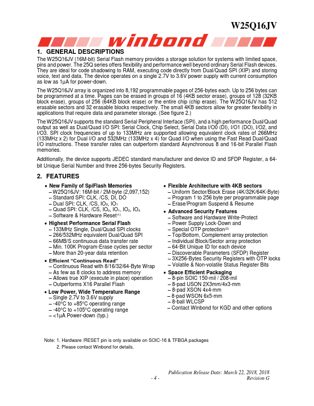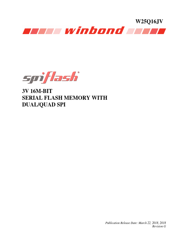 W25Q16JV 3V 16M-BIT SERIAL FLASH MEMORY WITH DUAL/QUAD SPI Publication Release Date: March 22, 2018, 2018 Revision G W25Q16JV 1. GENERAL DESCRIPTIONS The W25Q16JV (16M-bit) Serial Flash memory provides a storage solution for systems with limited space, pins and power.