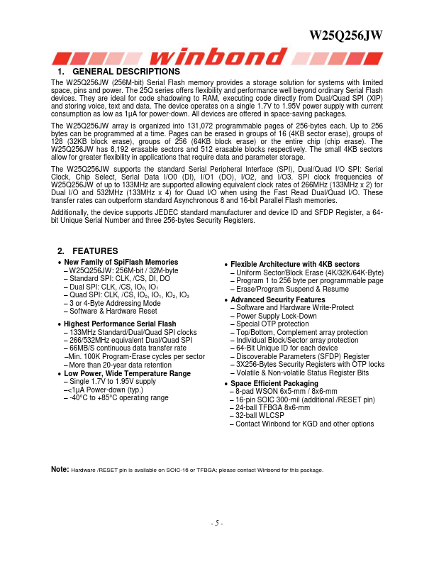 W25Q256JW 1.8V 256M-BIT SERIAL FLASH MEMORY WITH DUAL/QUAD SPI Publication Release Date: September 04, 2018 - Revision D W25Q256JW 1. GENERAL DESCRIPTIONS The W25Q256JW (256M-bit) Serial Flash memory provides a storage solution for systems with limited space, pins and power.