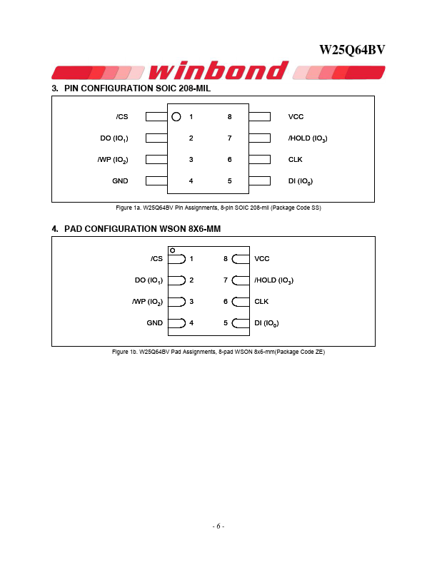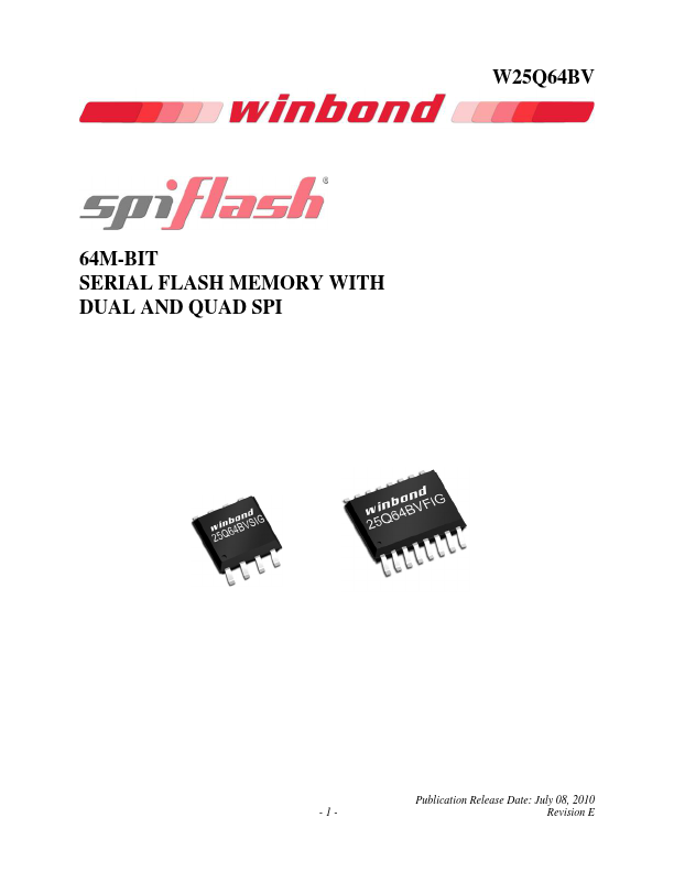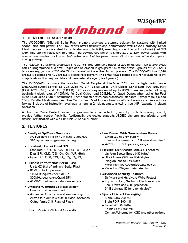 The W25Q64BV (64M-bit) Serial Flash memory provides a storage solution for systems with limited space, pins and power. The 25Q series offers flexibility and performance well beyond ordinary Serial Flash devices. They are ideal for code shadowing to RAM, executing code directly from Dual/Quad SPI (XIP) and storing voice, text and data.