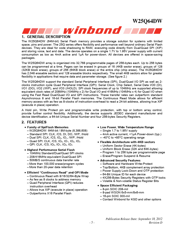 The W25Q64DW (64M-bit) Serial Flash memory provides a storage solution for systems with limited space, pins and power. The 25Q series offers flexibility and performance well beyond ordinary Serial Flash devices. They are ideal for code shadowing to RAM, executing code directly from Dual/Quad SPI (XIP) and storing voice, text and data.
