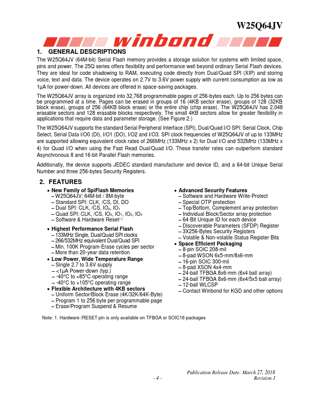 W25Q64JV 3V 64M-BIT SERIAL FLASH MEMORY WITH DUAL, QUAD SPI Publication Release Date: March 27, 2018 Revision J W25Q64JV 1. GENERAL DESCRIPTIONS The W25Q64JV (64M-bit) Serial Flash memory provides a storage solution for systems with limited space, pins and power.