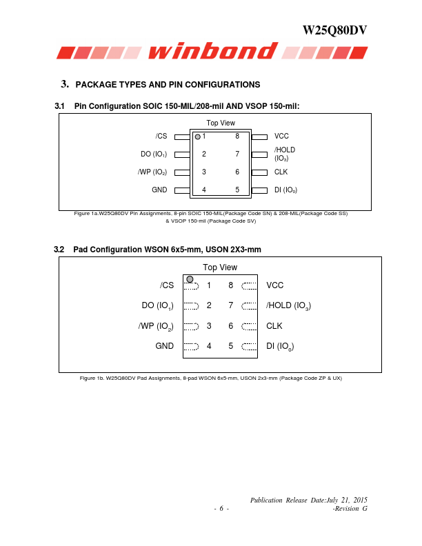 The W25Q80DV (8M-bit) Serial Flash memory provides a storage solution for systems with limited space, pins and power. The 25Q series offers flexibility and performance well beyond ordinary Serial Flash devices. They are ideal for code shadowing to RAM, executing code directly from Dual/Quad SPI (XIP) and storing voice, text and data.