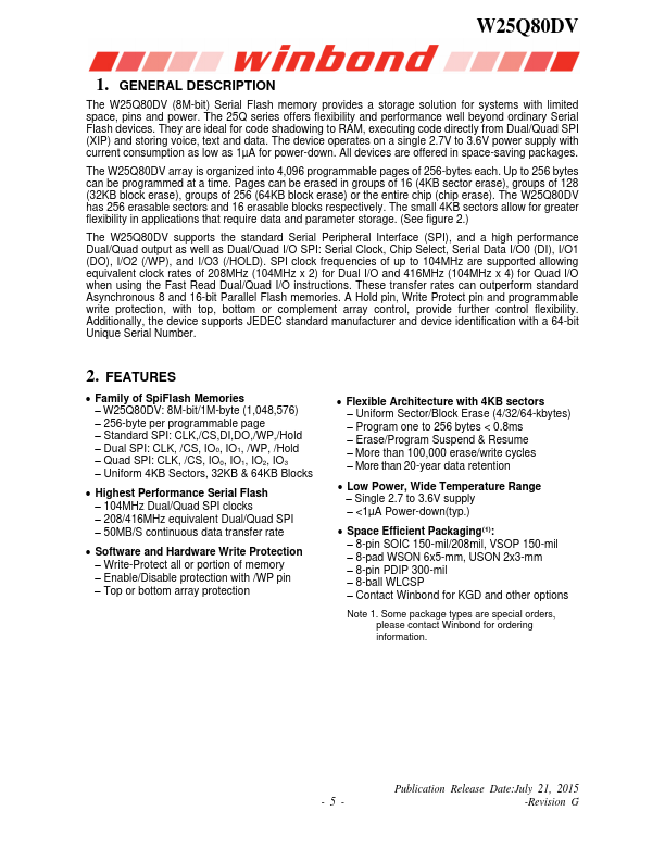 The W25Q80DV (8M-bit) Serial Flash memory provides a storage solution for systems with limited space, pins and power. The 25Q series offers flexibility and performance well beyond ordinary Serial Flash devices. They are ideal for code shadowing to RAM, executing code directly from Dual/Quad SPI (XIP) and storing voice, text and data.