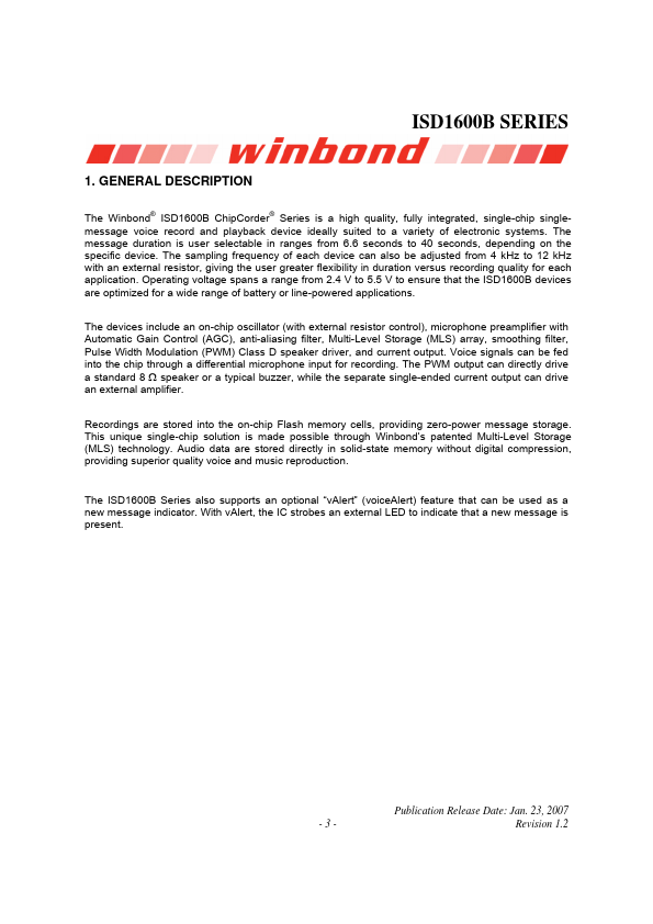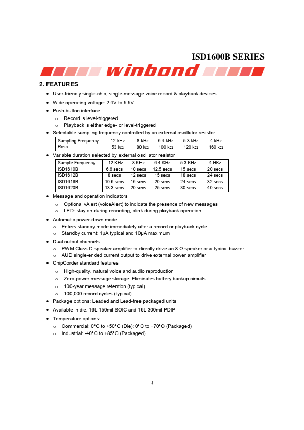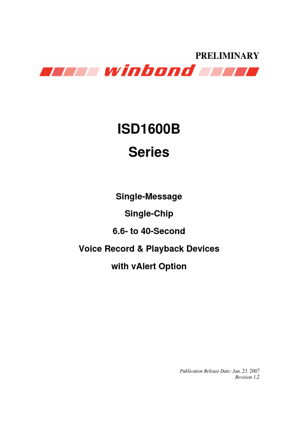 The Winbond® ISD1600B ChipCorder® Series is a high quality, fully integrated, single-chip singlemessage voice record and playback device ideally suited to a variety of electronic systems. The message duration is user selectable in ranges from 6.6 seconds to 40 seconds, depending on the specific device. The sampling frequency of each device can also be adjusted from 4 kHz to 12 kHz with an external resistor, giving...