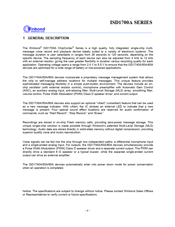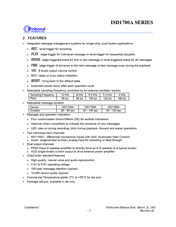 The Winbond® ISD1700A ChipCorder® Series is a high quality, fully integrated, single-chip multimessage voice record and playback device ideally suited to a variety of electronic systems. The message duration is user selectable in ranges from 26 seconds to 120 seconds, depending on the specific device. The sampling frequency of each device can also be adjusted from 4 kHz to 12 kHz with an external resistor, giving...