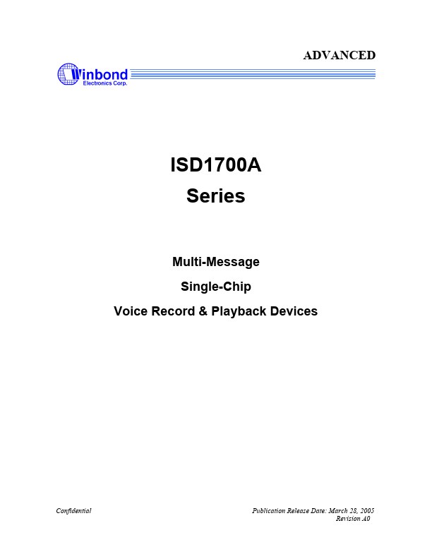 The Winbond® ISD1700A ChipCorder® Series is a high quality, fully integrated, single-chip multimessage voice record and playback device ideally suited to a variety of electronic systems. The message duration is user selectable in ranges from 26 seconds to 120 seconds, depending on the specific device. The sampling frequency of each device can also be adjusted from 4 kHz to 12 kHz with an external resistor, giving...