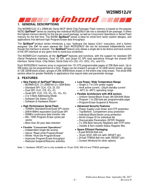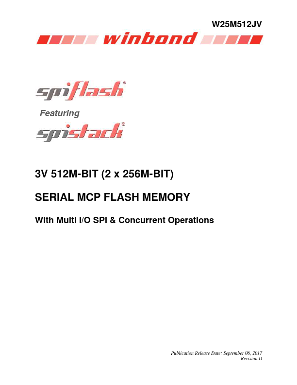 W25M512JV Featuring 3V 512M-BIT (2 x 256M-BIT) SERIAL MCP FLASH MEMORY With Multi I/O SPI & Concurrent Operations Publication Release Date: September 06, 2017 - Revision D W25M512JV 1. GENERAL DESCRIPTIONS The W25M512JV (2 x 256M-bit) Serial MCP (Multi Chip Package) Flash memory is based on the popular W25Q SpiFlash® series by stacking two individual W25Q256JV die into a standard 8-pin package.