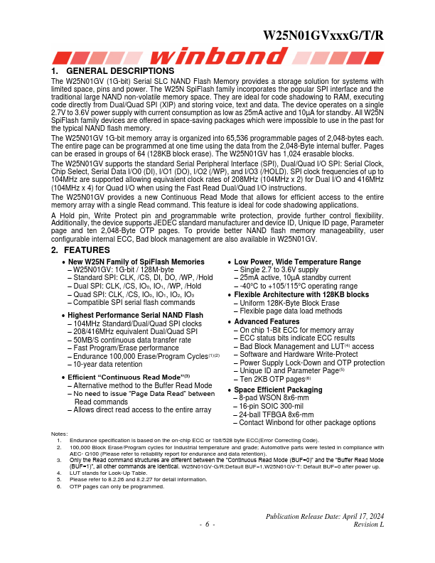 W25N01GVxxxG/T/R 3V 1G-BIT SERIAL SLC NAND FLASH MEMORY WITH DUAL/QUAD SPI BUFFER READ & CONTINUOUS READ For Automotive Grade Publication Release Date: April 17, 2024 Revision L W25N01GVxxxG/T/R 1. GENERAL DESCRIPTIONS The W25N01GV (1G-bit) Serial SLC NAND Flash Memory provides a storage solution for systems with limited space, pins and power.
