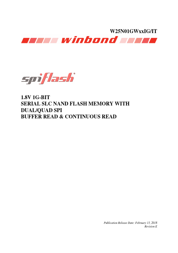 W25N01GWxxIG/IT 1.8V 1G-BIT SERIAL SLC NAND FLASH MEMORY WITH DUAL/QUAD SPI BUFFER READ & CONTINUOUS READ Publication Release Date: February 13, 2018 Revision E W25N01GWxxIG/IT 1. GENERAL DESCRIPTIONS The W25N01GW (1G-bit) Serial SLC NAND Flash Memory provides a storage solution for systems with limited space, pins and power.