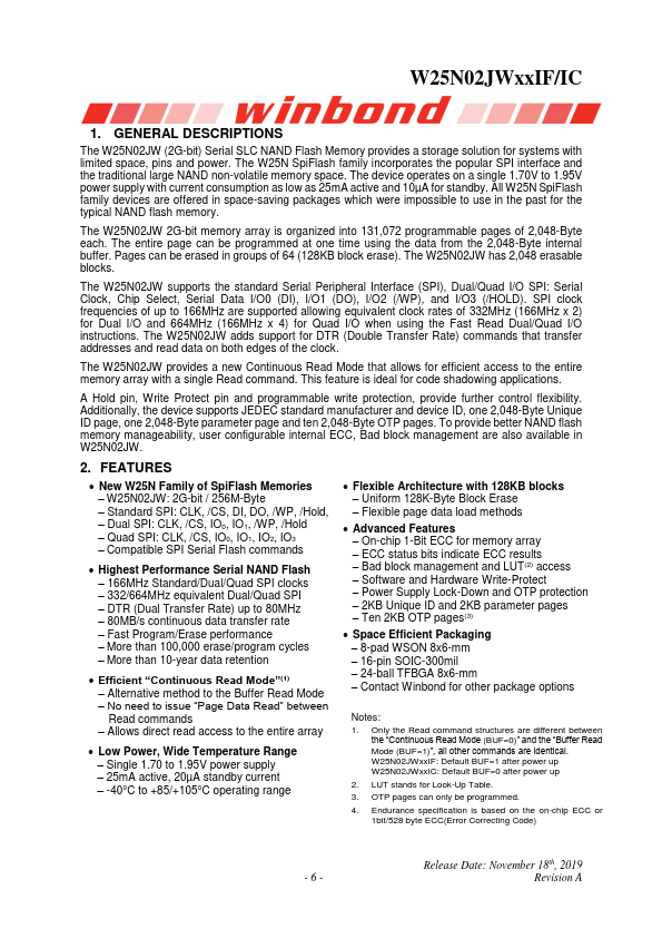 W25N02JWxxIF/IC 1.8V 2G-BIT SERIAL SLC NAND FLASH MEMORY DUAL/QUAD SPI WITH 166MHZ STR & 80MHZ DTR BUFFER READ & CONTINUOUS READ Release Date: November 18th, 2019 Revision A W25N02JWxxIF/IC 1. GENERAL DESCRIPTIONS The W25N02JW (2G-bit) Serial SLC NAND Flash Memory provides a storage solution for systems with limited space, pins and power.